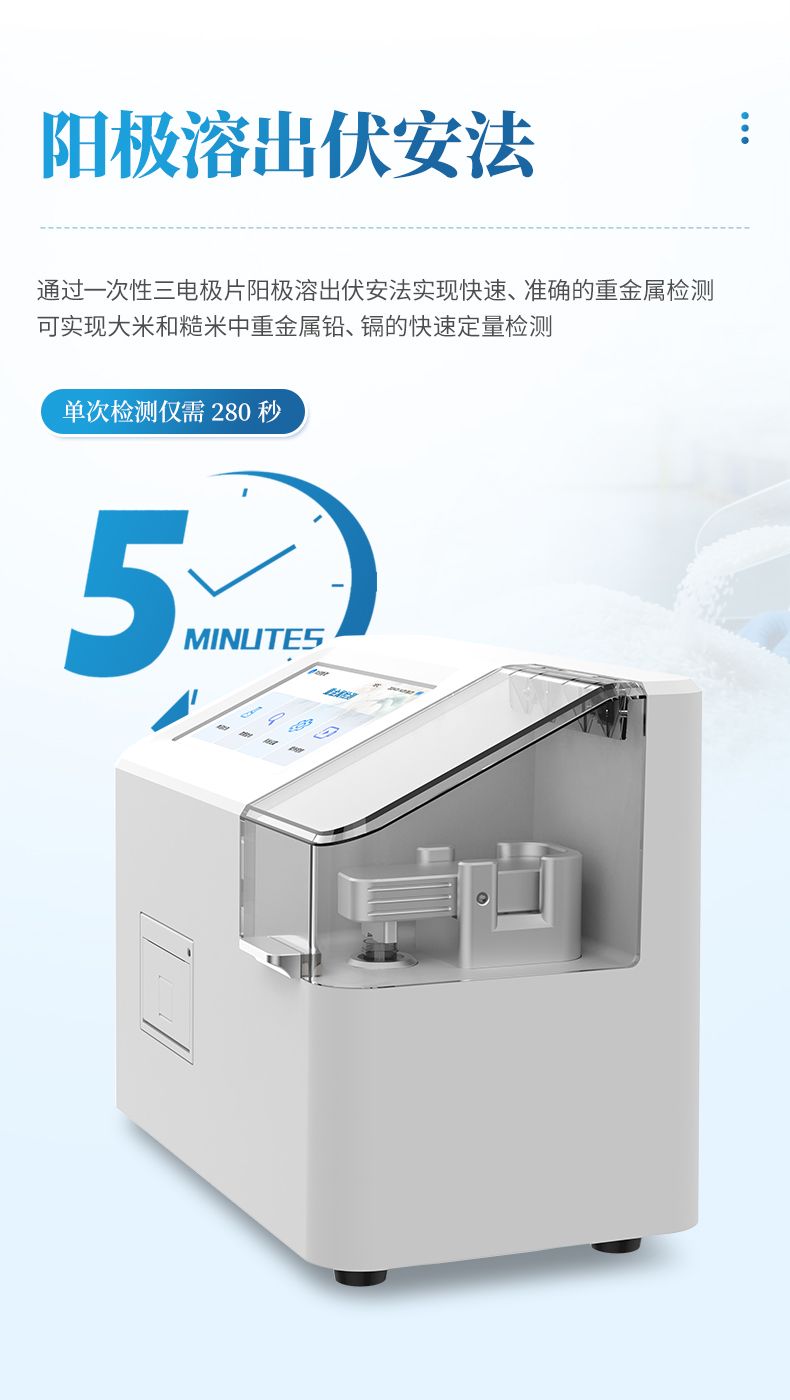 伏安法重金屬檢測儀(糧食重金屬速測儀)是一款高精度的電化學(xué)分析設(shè)備,專用于檢測大米和糙米中重金屬鉛、鎘的含量。該儀器通過一次性三電極片陽極溶出伏安法實(shí)現(xiàn)快速、準(zhǔn)確的重金屬檢測,配合絲網(wǎng)印刷電極耗材和簡易的樣本前處理方式,可實(shí)現(xiàn)大米和糙米中重金屬鉛、鎘的快速定量檢測。
