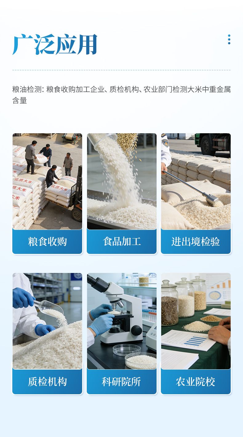 糧油檢測:糧食收購加工企業(yè)、質(zhì)檢機(jī)構(gòu)、農(nóng)業(yè)部門檢測大米中重金屬含量。