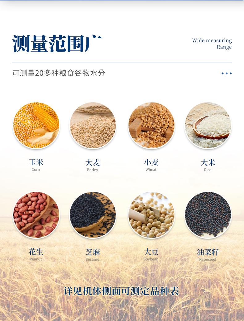 測(cè)量范圍:可測(cè)量谷類(lèi)、玉米、東北玉米、大麥、小麥、白小麥、大米、豆粕、花生仁、菜粕、高粱、黑芝麻、棉籽、棉粕、秈谷、大豆、油菜籽、飼料、蔬菜種子等非金屬顆粒狀物質(zhì)。