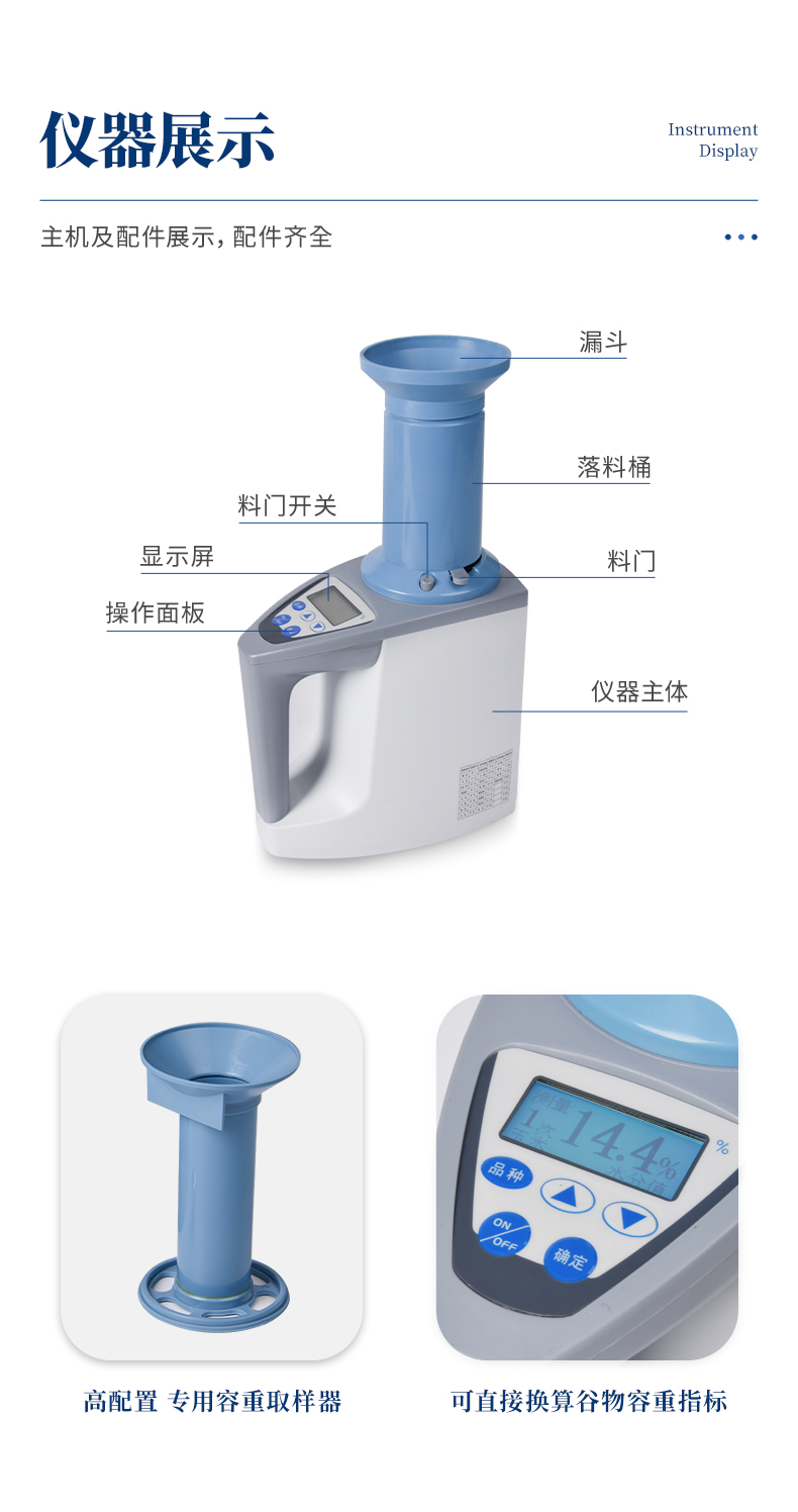 容重?fù)Q算:獨(dú)特的專利容重取樣裝置在精確測(cè)量小麥的同時(shí),可以直接換算出小麥容重指標(biāo)。